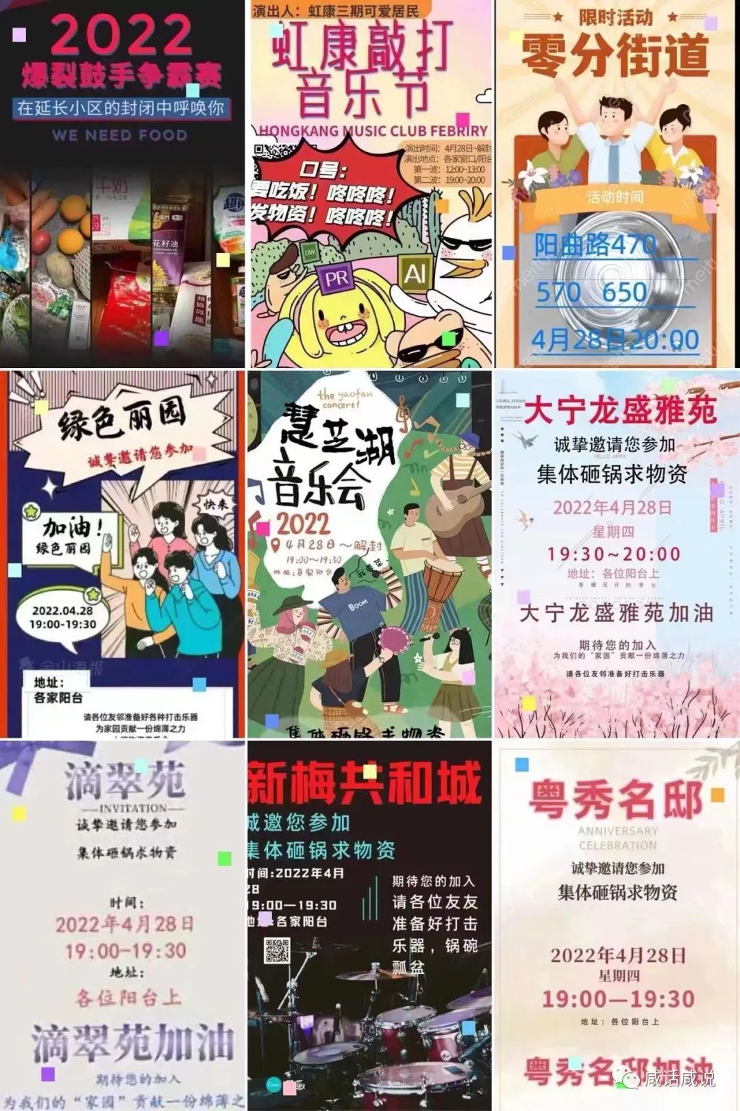或许是受了这几件事的刺激,傍晚时候各小区都在酝酿说晚上要搞敲盆行动。更有些小区连招贴画啊什么都出来了,千奇百怪、应有尽有。不晓得是我们小区年轻人少的关系、还是下雨的关系,这边倒是很安静。附近几个小区也都很安静。但是朋友圈上看、波及面还是不小。